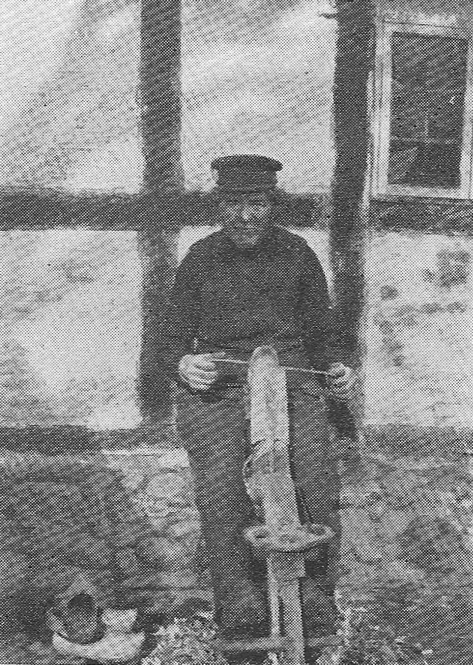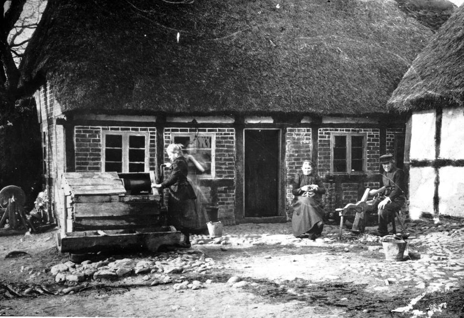 Her er han med sin kone og deres pige, der bruger brøndvinden. Ved gavlen står slibestenen til at væsse træskoværktøjet.