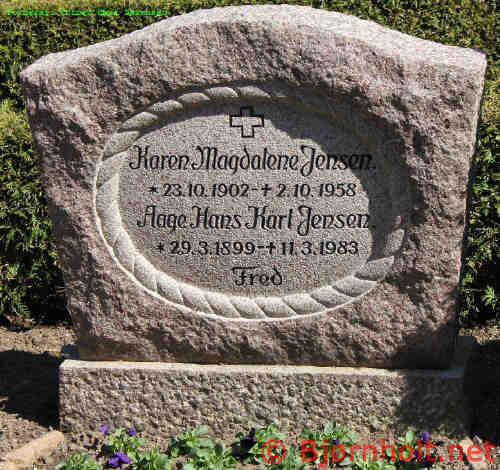 Aage blev gift med Karen Magdalene Nielsen [19578] [MRIN: 6711], datter af Gdr., Niels Nielsen [19579] og Thomine Petra Thomsen [19581], den 6. okt. 1923 i Rårup Kirke, Rårup Sogn, Bjerre, Vejle. (Karen Magdalene Nielsen [19578] blev født den 23. okt. 1902 i Belle Mark, Stouby Sogn, Bjerre, Vejle, dåb den 23. nov. 1902 i Stouby Kirke, Stouby Sogn, Bjerre, Vejle, døde den 2. okt. 1958 i Århus, Skt. Johannes Sogn og blev begravet den 7. okt. 1958 i Rårup Kirkegård, Rårup Sogn, Bjerre, Vejle.) |