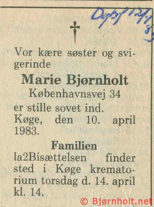 Marie blev gift med Alfred Emil Bjørnholt [116] [MRIN: 1358], søn af Bojle Andersen Bjørnholt [27] og Anna Kirstine Rasmussen [4993], den 5. maj 1935 i Køge Skt Nikolaj Sogn, Ramsø, Roskilde. (Alfred Emil Bjørnholt [116] blev født den 23. mar. 1912 i Holbækhuse, Benløse Sogn, Ringsted, Sorø, dåb den 8. sep. 1912 i Køge Glæiservej 17 Køge, Solbjerg Kirke, døde den 11. aug. 1963 i København, Rigshospitalet Sogn, Sokkelund, København og blev begravet den 17. aug. 1963 i Skt. Nikolaj Kirkegård, Køge Sct Nikolaj Sogn, Ramså, Roskilde.)