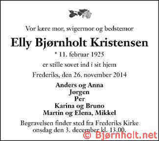 Elly blev gift med Jens Anker Kristensen [24197] [MRIN: 8296], søn af Anton Kristensen [26477] og Jenny Marie Kirstine Svendsen [26478], den 4. jun. 1949 i Frederiks Kirke, Frederiks Sogn, Lysgård, Viborg. (Jens Anker Kristensen [24197] blev født den 12. sep. 1925 i Søby, Albøge Sogn, Djurs Sønder, Randers, dåb den 18. okt. 1925 i Albøge Sogn, Djurs Sønder, Randers og døde cirka 2007.) |