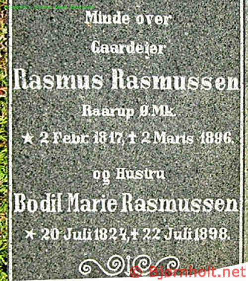 Rasmus blev gift med Bodil Marie Christensdatter [602] [MRIN: 202], datter af Cresten Clemmesen [987] og Mette Simonsdatter [988], den 10. nov. 1848 i Tamdrup Kirke, Tamdrup Sogn, Nim, Skanderborg. (Bodil Marie Christensdatter [602] blev født den 20. jul. 1824 i Vrønding, Tamdrup Sogn, Nim, Skanderborg, dåb den 12. sep. 1824 i Tamdrup Kirke, Tamdrup Sogn, Nim, Skanderborg, døde den 22. jul. 1898 i Rårup Østermark, Rårup Sogn, Bjerre, Vejle og blev begravet den 28. jul. 1898 i Rårup Kirkegård, Rårup Sogn, Bjerre, Vejle.) |