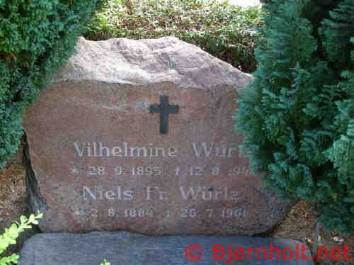 Vilhelmine blev gift med Hans Frederik Würtz [2752] [MRIN: 994], søn af Phillip Frederik Würtz [2753] og Ane Margrethe Hansdatter [2754], den 18. maj 1913 i Engesvang Sogn, Hids, Viborg. (Hans Frederik Würtz [2752] blev født den 2. aug. 1884 i Frederikshede, Frederiks Sogn, Lysgård, Viborg, dåb den 12. okt. 1884 i Frederiks Kirke, Frederiks Sogn, Lysgård, Viborg, døde den 26. jul. 1961 i Engesvang Sogn, Hids, Viborg og blev begravet den 29. jul. 1961 i Engesvang Kirkegård, Engesvang Sogn, Hids, Viborg.) |