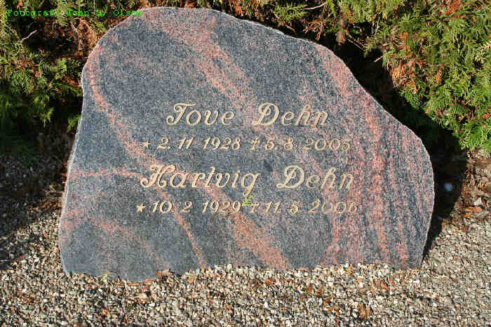 Tove blev gift med Gdr., Hartvig Peer Dehn [28398] [MRIN: 9801], søn af Møller, Peder Georg Frederiksen Dehn [28417] og Maren Kamilla Pedersen [28418], den 25. apr. 1953 i Avnsø Kirke, Avnsø Sogn, Skippinge, Holbæk. (Gdr., Hartvig Peer Dehn [28398] blev født den 10. feb. 1929 i Strøby Sogn, Stevns Herred, Præstø Amt, dåb den 24. mar. 1929 i Strøby Kirke, Strøby Sogn, Stevns Herred, Præstø Amt, døde den 10. maj 2006 og blev begravet i Tølløse Kirkegård, Tølløse Sogn, Merløse, Holbæk.) |