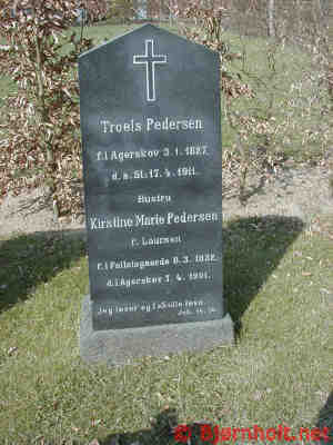 Troels blev gift med Kirsten Marie Laursdatter [6438] [MRIN: 2469], datter af Laurs Andersen [6495] og Kirsten Nielsdatter [6504], den 20. jun. 1855 i Sunds Kirke, Sunds Sogn, Hammerum, Ringkøbing. (Kirsten Marie Laursdatter [6438] blev født den 8. mar. 1832 i Fallesgaarde, Finderup Sogn, Nørlyng, Viborg, dåb den 11. mar. 1832 i Dollerup Kirke, Dollerup Sogn, Nørlyng, Viborg, døde den 7. apr. 1901 i Agerskov, Sunds Sogn, Hammerum, Ringkøbing, Denmark og blev begravet den 15. apr. 1901 i Ilskov Kirke, Sunds Sogn, Hammerum, Ringkøbing.)