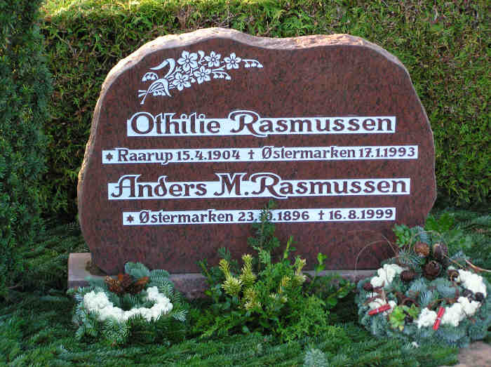 Otilia blev gift med Anders Marius Rasmussen [270] [MRIN: 217], søn af Søren Rasmussen, "a-Smedemand" [271] og Kjerstine Marie Mikkelsen [272], den 12. okt. 1923 i Rårup Kirke, Rårup Sogn, Bjerre, Vejle. (Anders Marius Rasmussen [270] blev født den 23. okt. 1896 i Rårup Østermark, Rårup Sogn, Bjerre, Vejle, dåb den 29. okt. 1896 i Hj. Dåb, I Rårup Kirke D. 22-11-1896, døde den 16. aug. 1999 i Birkelund, Juelsminde Sogn, Bjerre, Vejle og blev begravet i aug. 1999 i Rårup Kirkegård, Rårup Sogn, Bjerre, Vejle.) |